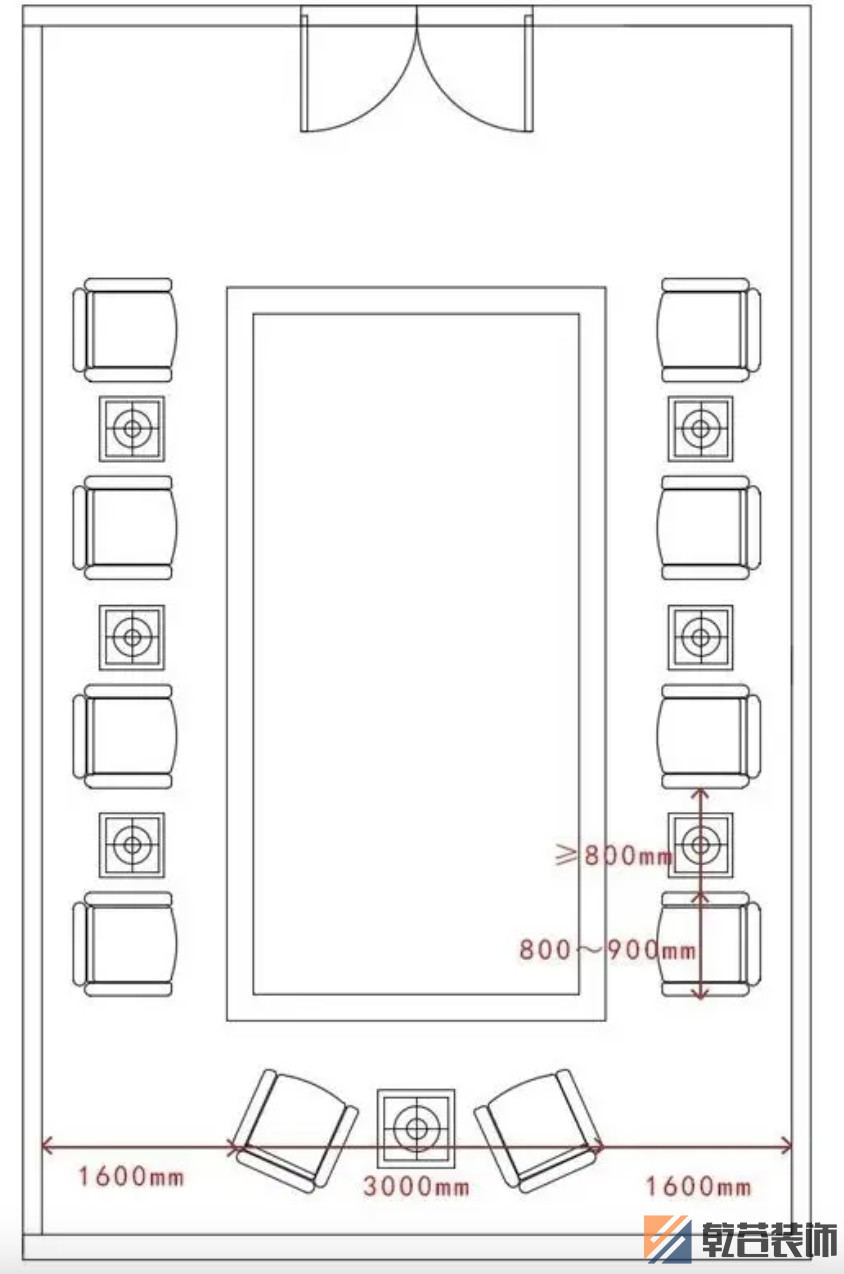 办公室装修一 VIP接待室。简单来说就是贵宾接待室。接待室的正前方为主位座,两主位中间由功能台进行分隔,接待室功能台分隔要不小于0.6米。主位桌椅组合尺寸为3米,主位椅离墙距离不能小于1.6米;其他席位的椅子之间距离不能小于0.45米,也最好不要大于0.8米。