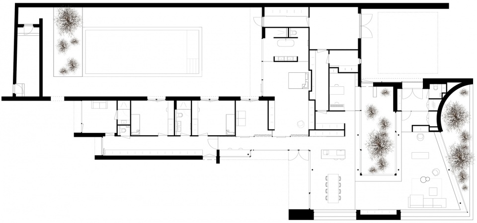 生活区中心是郁郁葱葱的庭院,通过地板和天花之间的全玻璃推拉门可以看到旁边的庭院和泳池。