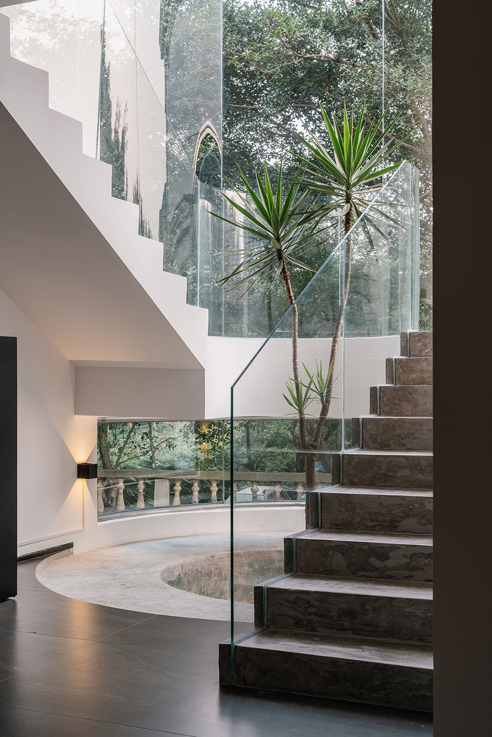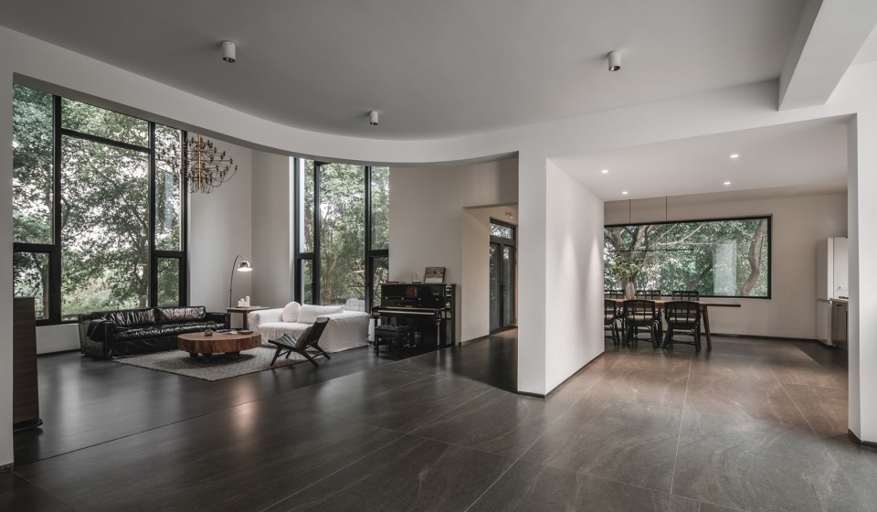 设计师在新近完成的江安别墅私宅作品中,对家宅的庇护性与日常性,做了些不同于往常的探索。更有意思的是,穿梭于空间之中,还能隐隐感受到一种巴什拉式的空间诗意。这座位于成都双流的独栋别墅,共两层,面积为340平方米。一楼大厅是7米高的挑空空间,7米高的墙面上,一正一侧各辟出五米高的大窗户,最大尺度地将室内与室外融合为一体。