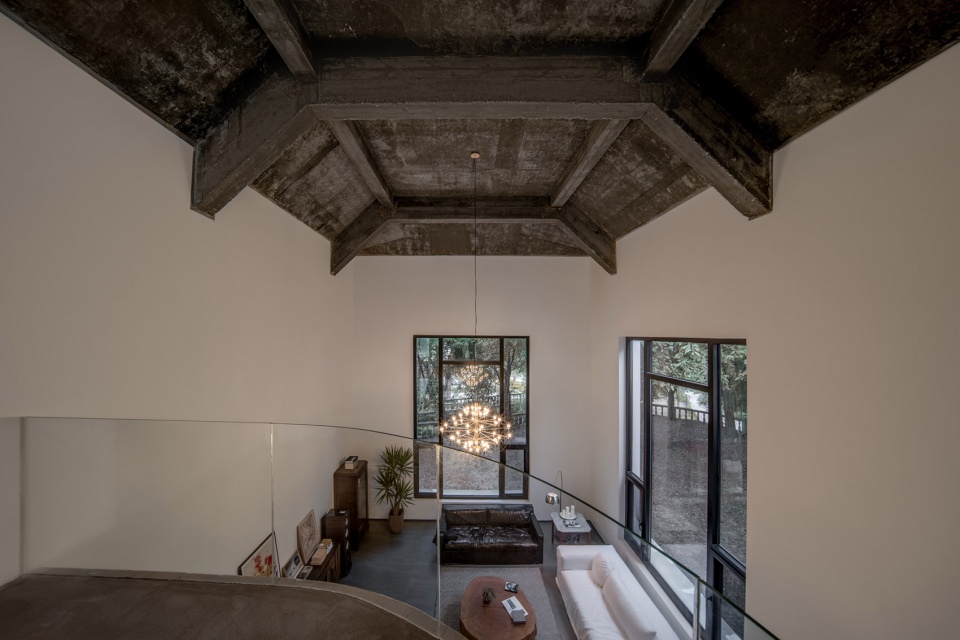 一楼的非承重墙几乎被全部拆除,使得一楼在平面上呈现出开放的状态,呼应着7米高的纵向挑高,让空间延续而流动。二楼则是根据光、视野、需求的不同,进行功能空间的重新规划与组合,形成不同的空间形式与尺度,增强居住体验与空间呵护感。