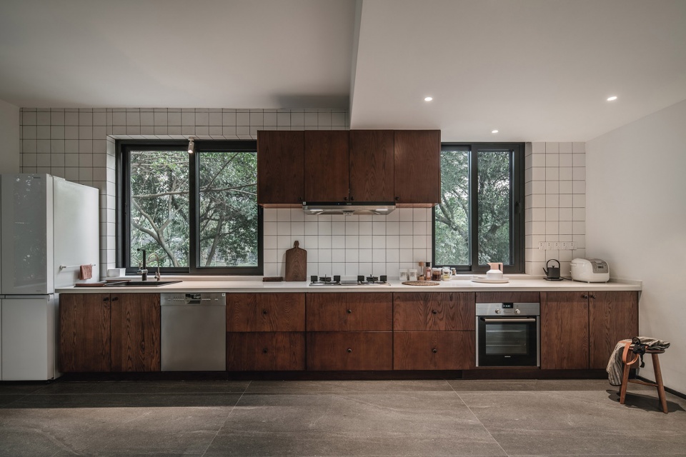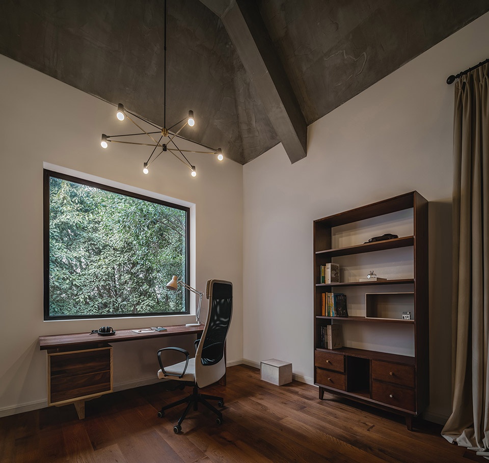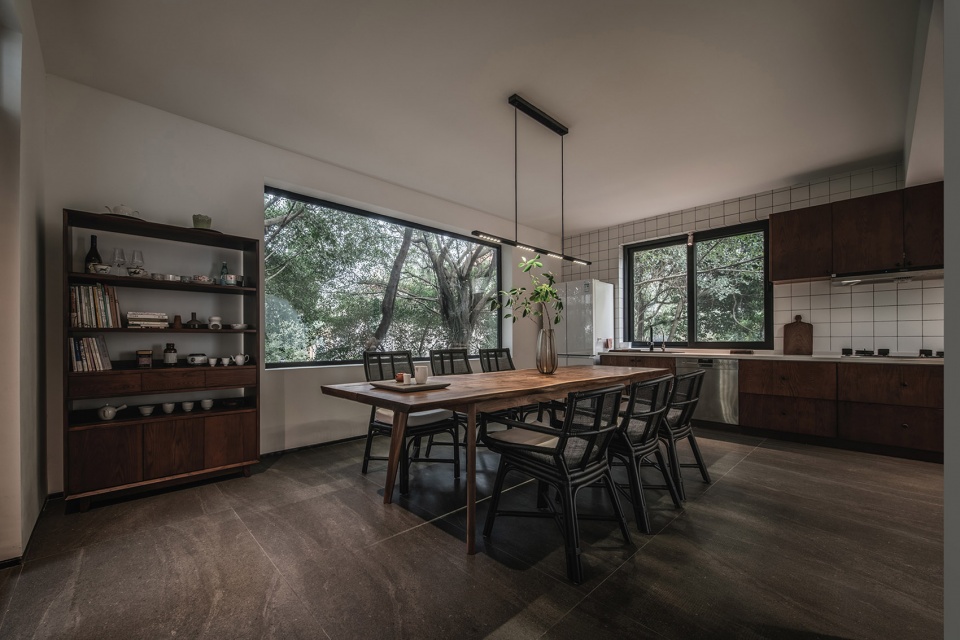 当树影摇曳,阳光和着绿影斑斑点点地洒落进来,整个空间便有了不一样的自然灵韵与静谧之情。整个空间干净、自然、熟稔。