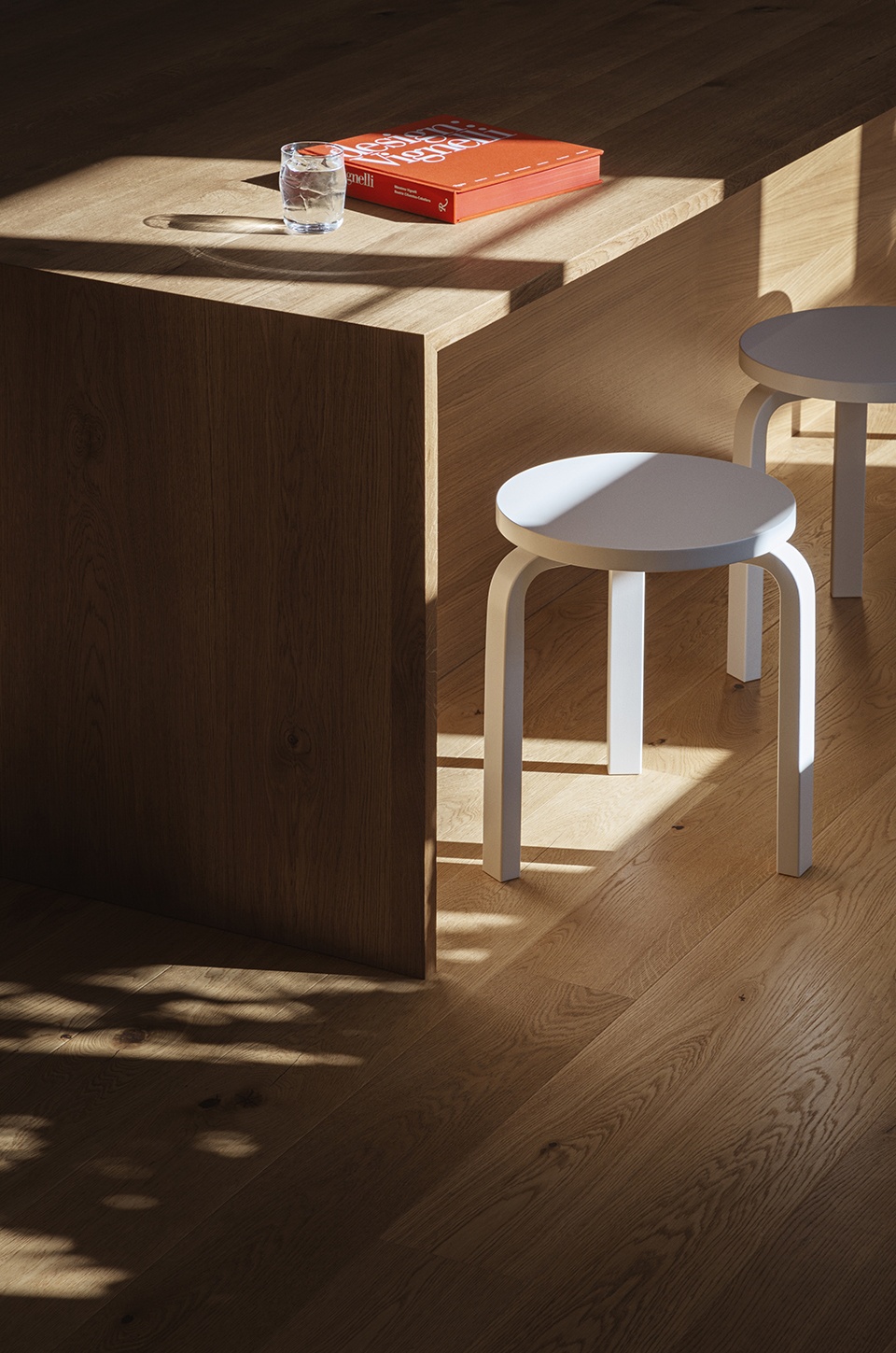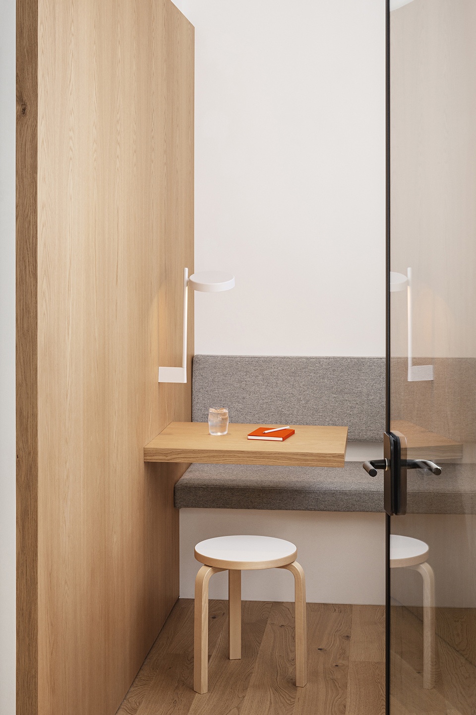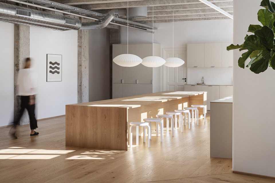 整体材料的选择突出了橡木、柔和的中性色和柔软的纺织品,营造出宁静淡雅的环境。透明的隔断和整体通风的空间促进了开放的工作环境和社区氛围,符合Work & Co协同工作的核心理念。在新冠时期,宽敞的空间允许员工在必要时保持距离。形式和功能一直是家具选择的重要因素。几何家具易于识别,有助于实现空间的简洁与宁静。国际形式和Scandinavian风格的组合突出Work & Co的全球视野,同时也是对新地点的致意。