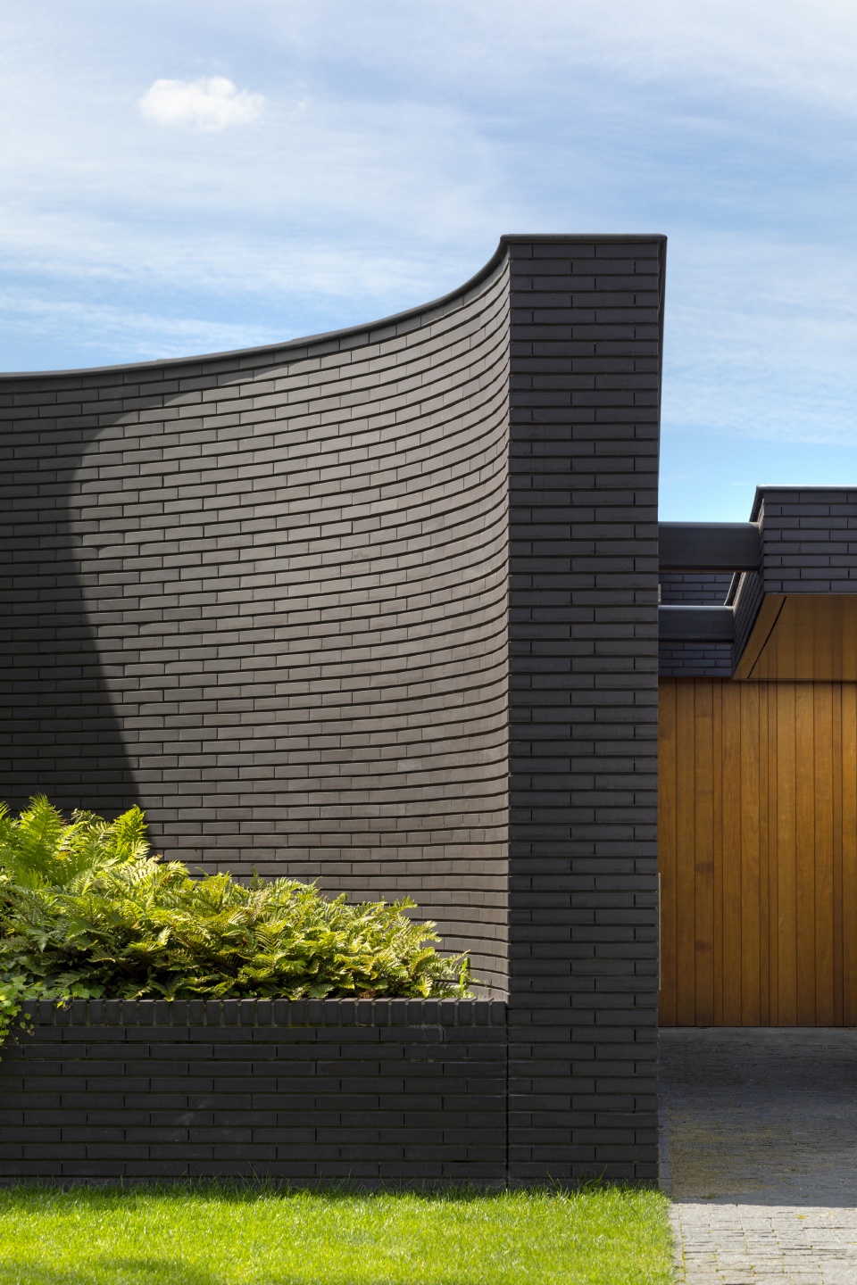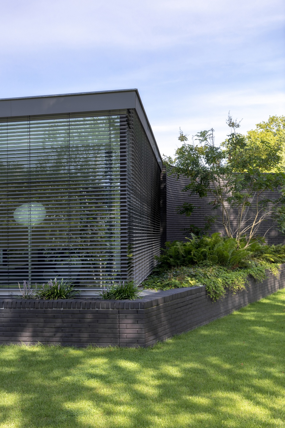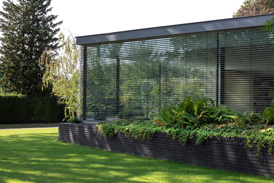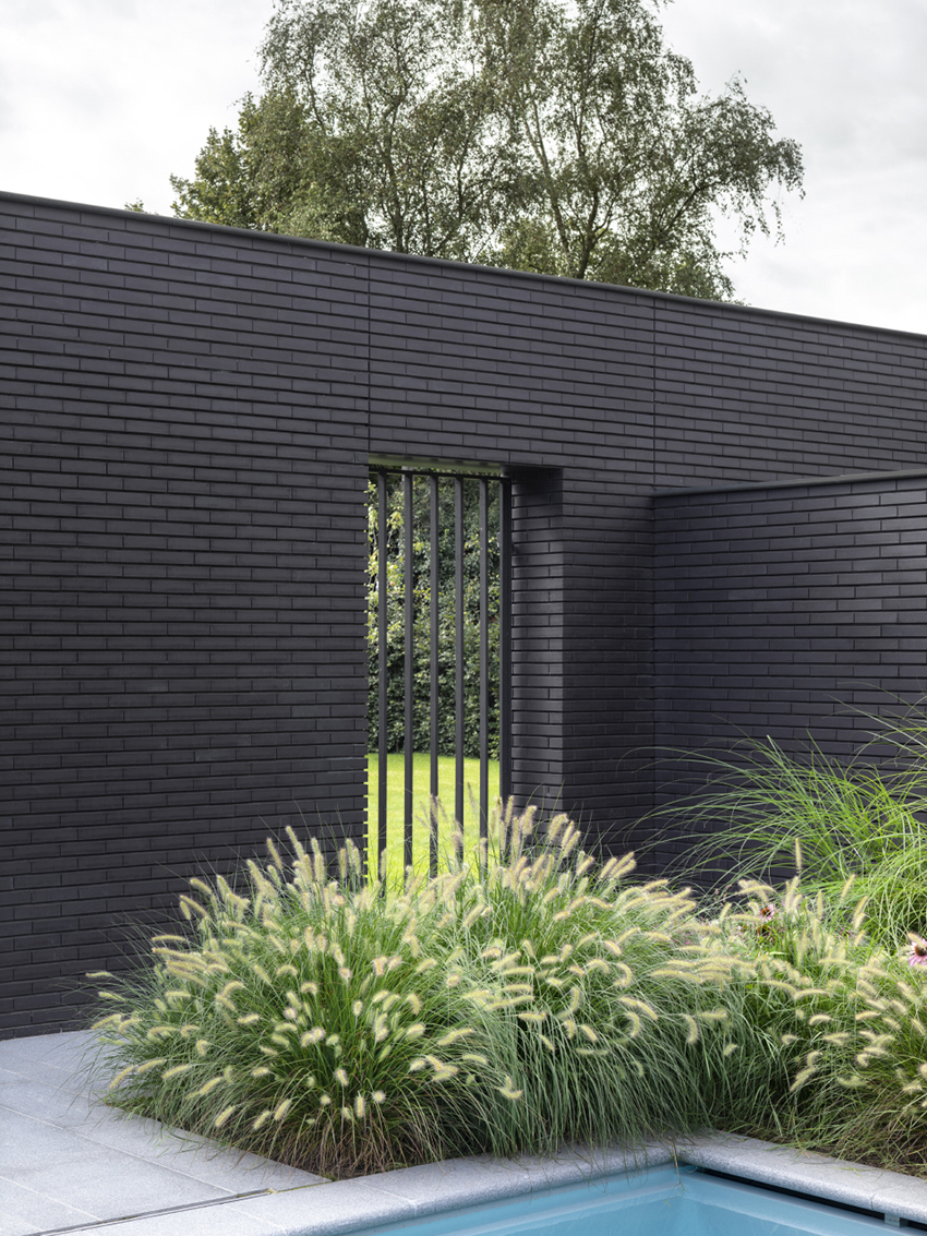 这座宽敞的别墅专为四口之家设计,所有房间均水平相连。房屋宽敞且可持续,模糊了室内外的界限。外立面全部使用黑砖,遮挡了后部景观,突显出旁边的自然环境。建筑主立面的右侧种有大量绿植,屋顶设有地热储能器、热泵和太阳能集热器,达到有效节能的效果,实现了室内外空间的自然相接。