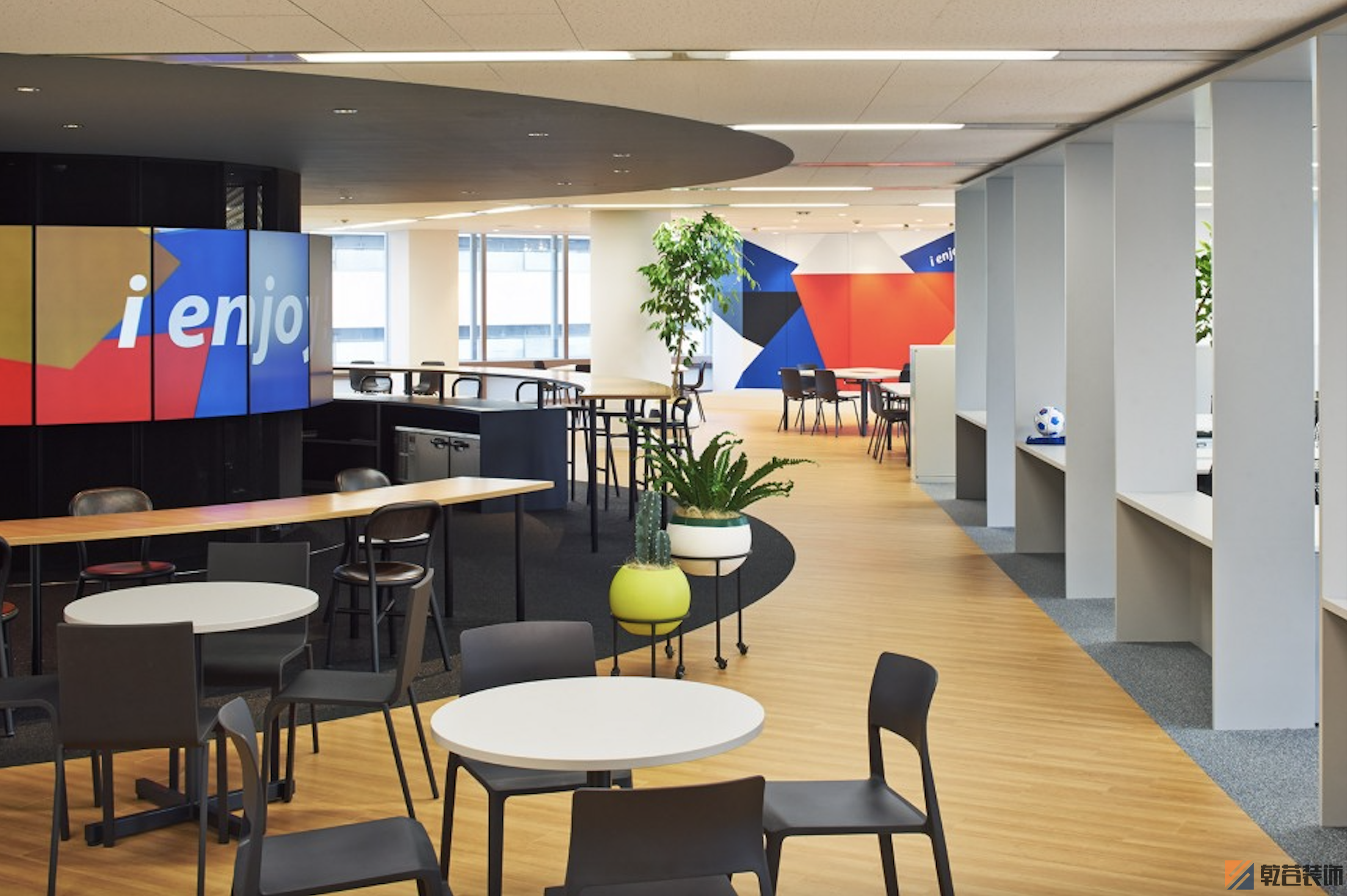 入口地板的渐变花纹体现出体育节日兴高采烈的欢呼感。入口处有一个360度的屏幕,四周一圈可供人休息或者工作的圆型桌子。这里是整个办公空间的开放区域中心,能在残奥会期间让体育联盟的代表,运动员,游客能愉快的聚集在一起。同时在这个中心也能有效联系扇形建筑两端工作区域。